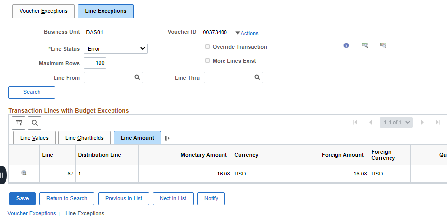 - Click the Line Exceptions tab to view the voucher line that causes the error.