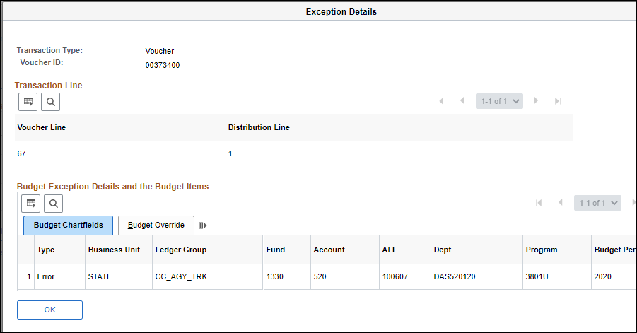 If the voucher has exceeded the budget, the budget officers at the agency have security access in OAKS FIN to update or correct the budget. Notify the budget officer for the agency or division when a budget needs correction. When the agency budget officer corrects the budget, OAKS FIN automatically runs budget checking and resolves the problem.